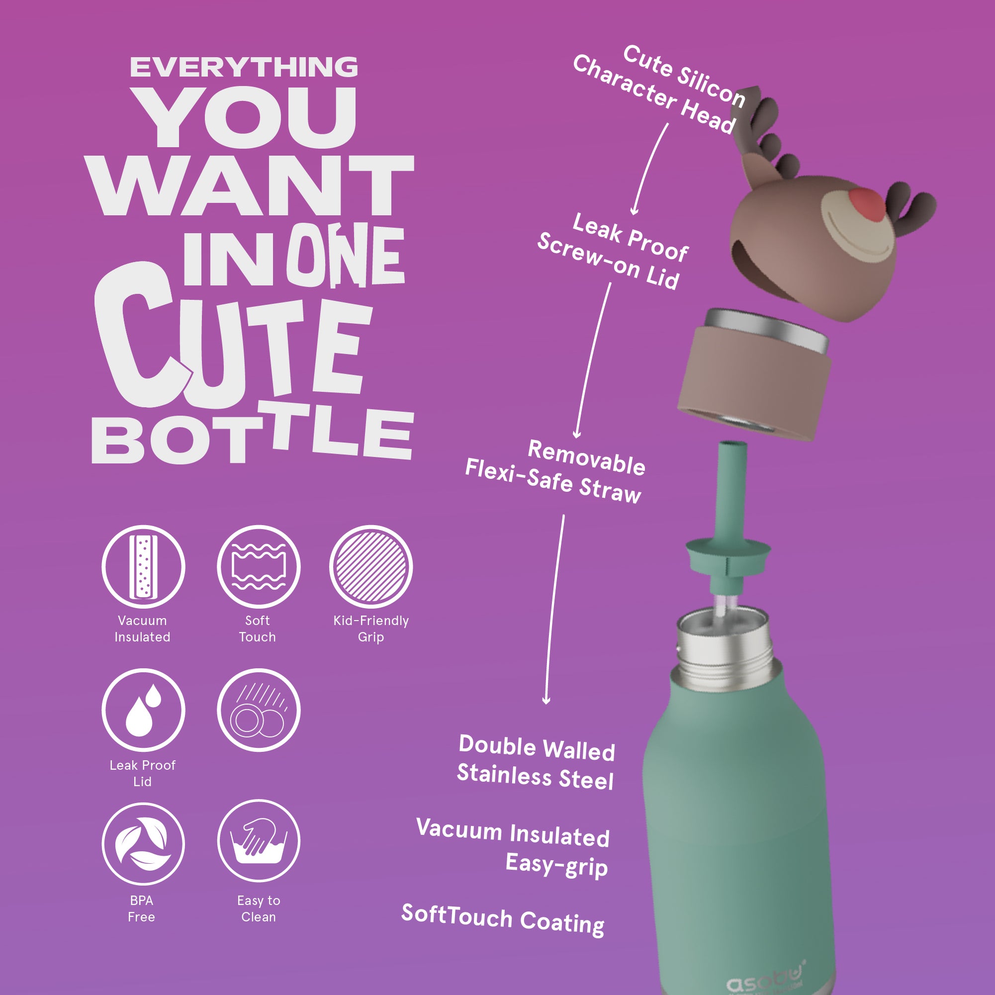 Das besondere Highlight ist der Reindeer-Charakterkopf aus Silikon. Er sorgt nicht nur für gute Laune, sondern motiviert Kinder spielerisch, mehr zu trinken. Der Kopf ist abnehmbar, was die Nutzung flexibel und die Reinigung einfach macht. Zusammen mit dem integrierten Trinkhalm ist die Flasche bestens auf Kinder zugeschnitten.