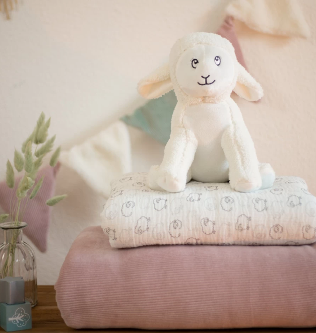 Pflegeleicht: waschbar bei 30 °C, kein Bleichen, geringe Trocknung, warmes Bügeln erlaubt. So bleibt die Babydecke lange weich und formstabil.